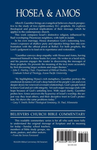 Allen R. Guenther brings an evangelical believers church perspective to the study of two eighth-century B.C. prophets. He explores theological and practical implications of their message, which he applies to the contemporary church. This work compares Israel's distinctive religion, influenced by Baal-worshiping Phoenician neighbors, with faith in Judah. In his own marriage, Hosea dramatizes God's redeeming love. Amos's exposure of shallow piety and injustice brings him into confrontation with the official priest at Bethel. For both prophets, the Lord's judgment is to lead on to repentance and restoration.430 Pages.