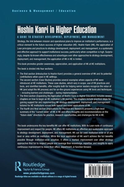 The book is divided into four sections: The first section (Introduction to Hoshin Kanri) provides a general overview of HK and its potential contributions when used in HE settingsThe second section (Case Studies) provides several examples where aspects of HK were introduced at HE institutions. These case studies, which vary in scope, use of HK practices and tools, and identified benefits, offer insights both for helping senior leaders recognize the value of HK (and adopt the HK process) and for on-the-ground experiences using HK tools and techniques - including barriers and challenges - during implementationThe third section (Expanding the Application of Hoshin Kanri in Higher Education) includes several chapters on how to begin an HE institution's HK journey. The chapters include practical steps for gaining support for and implementing HK strategy development, deployment, and management tailored for HE institutions across both typical and novel applications of HKThe fourth and final section (Implications for Practice and Research) presents a high-level summary of the "current state" of HK in HE and offers thoughts and recommendations on the "future state" directions for practice, research opportunities, and challenges for HK in HE The book underscores the key benefits HK can offer HE institutions. With its Lean roots of continuous improvement and respect for people, HK offers HE institutions an effective and sustainable approach to strategy development, deployment, and management. HK can be used institution-wide or at any level or area within an institution. While the local application of HK won't achieve the full benefits possible through institution-wide adoption, it offers a marked improvement over other strategy approaches that fail to respect people and leverage their knowledge, expertise, and insights to apply continuous improvement to move their office, department, or function forward.