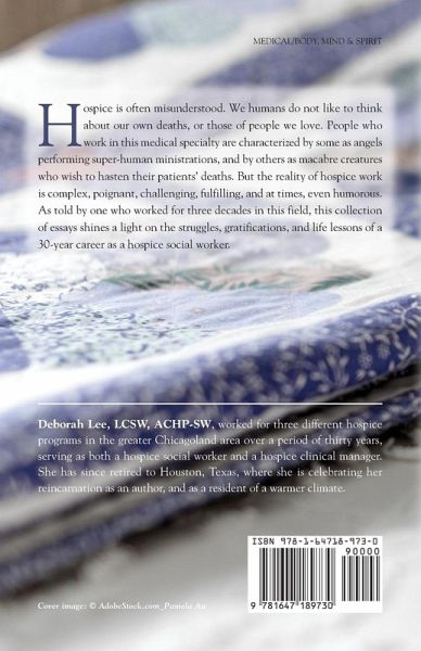 Hospice is often misunderstood. We humans do not like to think about our own deaths, or those of people we love. People who work in this medical specialty are characterized by some as angels performing super-human ministrations, and by others as macabre creatures who wish to hasten their patients' deaths. But the reality of hospice work is complex, poignant, challenging, fulfilling, and at times, even humorous. As told by one who worked for three decades in this field, this collection of essays shines a light on the struggles, gratifications, and life lessons of a 30-year career as a hospice social worker.