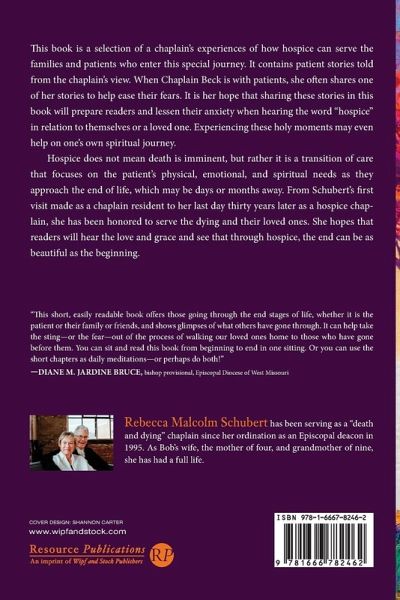 This book is a selection of a chaplain's experiences of how hospice can serve the families and patients who enter this special journey. It contains patient stories told from the chaplain's view. When Chaplain Beck is with patients, she often shares one of her stories to help ease their fears. It is her hope that sharing these stories in this book will prepare readers and lessen their anxiety when hearing the word ""hospice"" in relation to themselves or a loved one. Experiencing these holy moments may even help on one's own spiritual journey. Hospice does not mean death is imminent, but rather it is a transition of care that focuses on the patient's physical, emotional, and spiritual needs as they approach the end of life, which may be days or months away. From Schubert's first visit made as a chaplain resident to her last day thirty years later as a hospice chaplain, she has been honored to serve the dying and their loved ones. She hopes that readers will hear the love and grace and see that through hospice, the end can be as beautiful as the beginning.