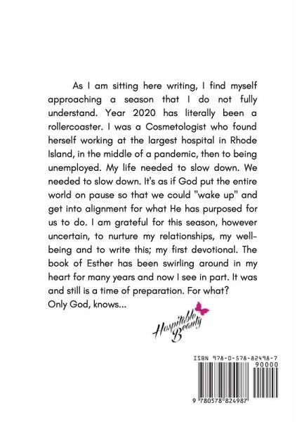 Journal through the book of Esther and her process to purpose. We see Esther's transformative process to purpose from a young Jewish girl to a Persian queens. Prepare your heart for all that God has for you. Now is the time of preparation. Included are some natural beauty preparations written by the author and licensed Cosmetologist of Hospitable Beauty. www.hospitablebeauty.com