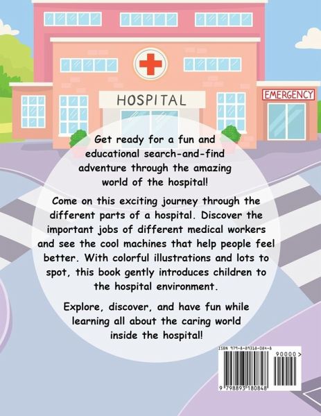 Do you have a smart and curious little one who is eager to learn about the hospital environment in a fun and engaging way? Written by a physician, Hospital Search and Find is the perfect way to gently introduce young children to the world of the hospital in a fun, engaging, and educational way! This vibrant search-and-find book transforms the hospital into an exciting adventure, packed with colorful illustrations and tons of things to discover. It is more than just a search-and-find book - it's a playful learning experience that offers: Endless Entertainment: Hours of fun as your little one hunts for hidden objects in every detailed scene. Gentle Education: Introduces key hospital areas and basic medical equipment in an age-appropriate way. Vocabulary Building: Encourages language development as your little one names the different objects (and people) they find. Visual Discrimination Skills: Sharpens observation skills and attention to detail. Reduces Anxiety: Familiarizes your little one with the hospital setting, with the goal of easing their fears and misconceptions while building their confidence. Perfect for Ages 3-8: Designed with bright, engaging illustrations and just the right level of challenge for young eyes. Inside Hospital Search and Find, your little one will embark on exciting search-and-find journeys through the following areas: Outside of hospital Lobby Emergency room Cafeteria Outpatient clinic Laboratory Pharmacy Radiology Operating room Labor and delivery And finally, the pediatric floor! Each page is a new opportunity to: Spot specific characters and objects. Learn about what they do and why they are important. Engage in conversations about health and helping others. At the back of the book, readers will find the answer key, a glossary of various medical items, and a bonus section to learn about the diverse hospital staff who contribute to its healing environment. Give the gift of fun, learning, and understanding! Hospital Search and Find is the perfect addition to any child's library, a wonderful tool for preparing for a hospital visit or stay, or simply a delightful way to explore a fascinating world from the comfort of home. Get your copy today!
