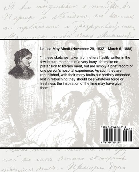 Louisa May Alcott (November 29, 1832 - March 6, 1888) was an American novelist. She is best known for the novel Little Women, which she wrote in 1868. This novel was loosely based on her childhood experiences with her three sisters. These sketches, taken from letters hastily writter in the few leisure moments of a very busy life, make no pretension to literary merit, but are simply a brief record of one person's hospital experience. As such they are republished, with their many faults but partially amended, lest in retouching they should lose whatever force or freshness the inspiration of the time may have given them