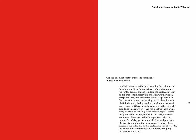 Hospital documents Pope.L's 2023 exhibition at the South London Gallery, which tragically turned out to be the last in his lifetime. With an essay by Legacy Russell, an introduction by Margot Heller, and an interview with the artist.