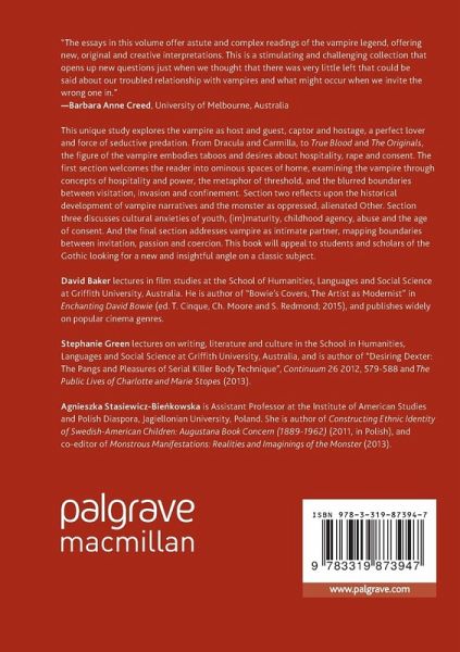 "With its fresh insight into vampire genre, this book will appeal to academics, students and general public alike. ... this proves itself a worthy edition to vampire studies by looking at hospitality (and, of course, invitations), rape and consent and how the vampire film/story examines and explores those concepts." (Taliesin meets the vampires, taliesinttlg.blogspot.de, December, 2017)