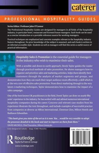 'Hospitality Sales and Promotion' is the essential guide for every manager in the hospitality industry wanting to achieve maximum profits from their sales promotions. Practical and down-to-earth, this guide discovers:* who is your customer? market segments and groups* how can you reach them effectively? the secrets of successful public relations* new and traditional technologies; from direct mail to using the Internet to maximum advantage.Derek Taylor has a wealth of experience in the hospitality industry and has worked with and advised numerous international corporate hospitality companies. Concrete and relevant case studies and examples from his experience are used to illustrate throughout the guide, from companies such as: Whitbread, Hilton International, Pizza Express and Stakis.