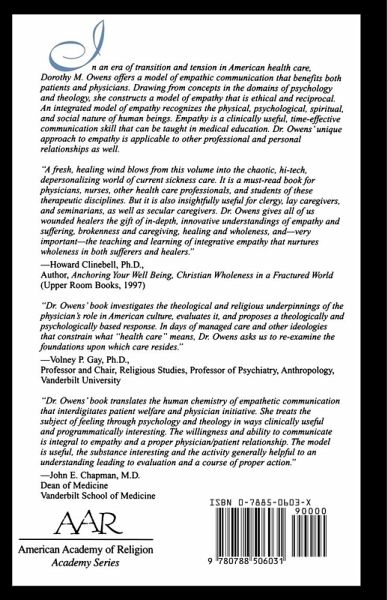 In an era of transition and tension in American health care, Dorothy M. Owens offers a model of empathic communication that benefits both patients and physicians. Drawing from concepts in the domains of psychology and theology, she constructs a model of empathy that is ethical and reciprocal. An integrated model of empathy recognizes the physical, psychological, spiritual, and social nature of human beings. Empathy is a clinically useful, time-effective communication skill that can be taught in medical and pastoral education. Dr. Owens's unique approach to empathy is applicable to other professional and personal relationships as well.