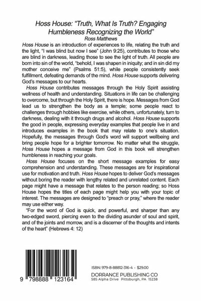 Hoss House is an introduction of experiences to life, relating the truth and the light, "I was blind but now I see" (John 9:25), contributes to those who are blind in darkness, leading those to see the light of truth. All people are born into sin of the world, "behold, I was shapen in iniquity; and in sin did my mother conceive me" (Psalms 51:5), while people consistently seek fulfillment, defeating demands of the mind. Hoss House supports delivering God's messages to our hearts. Hoss House contributes messages through the Holy Spirit assisting wellness of health and understanding. Situations in life can be challenging to overcome, but through the Holy Spirit, there is hope. Messages from God lead us to strengthen the body as a temple; some people react to challenges through hobbies like exercise, while others, unfortunately, turn to darkness, dealing with it through drugs and alcohol. Hoss House supports the good in people, expressing everyday examples that people live in and introduces examples in the book that may relate to one's situation. Hopefully, the messages through God's word will support wellbeing and bring people hope for a brighter tomorrow. No matter what the struggle, Hoss House hopes a message from God in this book will strengthen humbleness in reaching your goals. Hoss House focuses on the short message examples for easy comprehension and understanding. These messages are for inspirational use for motivation and truth. Hoss House hopes to deliver God's messages without boring the reader with lengthy related and unrelated content. Each page might have a message that relates to the person reading; so Hoss House hopes the titles of each page might help you with your topic of interest. The messages are designed to "preach or pray," where the reader may use either way. "For the word of God is quick, and powerful, and sharper than any two-edged sword, piercing even to the dividing asunder of soul and spirit, and of the joints and morrow, and is a discerner of the thoughts and intents of the heart" (Hebrews 4: 12)