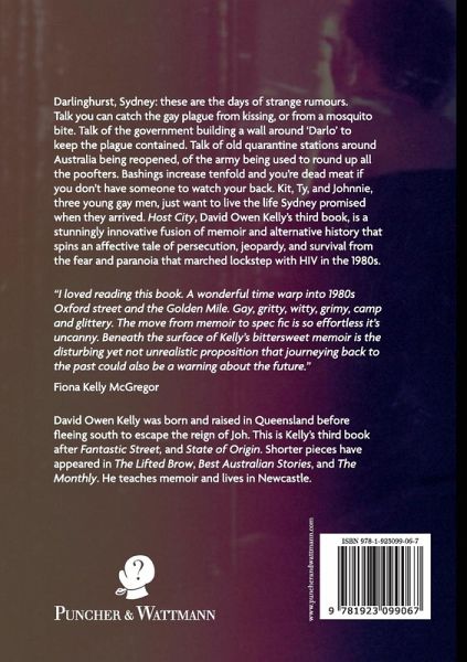 Darlinghurst, Sydney: these are the days of strange rumours. Talk you can catch the gay plague from kissing, or from a mosquito bite. Talk of the government building a wall around 'Darlo' to keep the plague contained. Talk of old quarantine stations around Australia being reopened, of the army being used to round up all the poofters. Bashings increase tenfold and you're dead meat if you don't have someone to watch your back. Kit, Ty, and Johnnie, three young gay men, just want to live the life Sydney promised when they arrived. Host City, David Owen Kelly's third book, is a stunningly innovative fusion of memoir and alternative history that spins an affective tale of persecution, jeopardy, and survival from the fear and paranoia that marched lockstep with HIV in the 1980s.