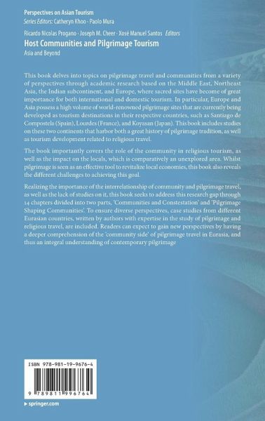 Chapter 1 Communities and pilgrimage in tourism research- Chapter 2 Sacred Spaces and the 'Other': Social Distance, Functional Distance, and Two Pilgrimage Sites in Asia.- Chapter 3 Development of Tourism Governance for Religious Tourism: A New Form of Local Community in Najaf, Iraq.- Chapter 4 Tourism visitors, pilgrimage and contested spaces: community, heritage, ecology and perception.- Chapter 5 Monastic Hosts' Sentiments Toward Hosting Buddhist Associations' Group Pilgrims The Case of Pu-Tuo.- Chapter 6 Pilgrimage tourism to sacred places of high Himalaya and its impact on residents across generations. The case of Yamunotri Temple.- Chapter 7 Impacts of processional pilgrimage on host communities: Insights from the Palkhi pilgrimage in India.- Chapter 8 Pilgrimage Tourism in Palestine: The Backbone of the Palestinian Economy.- Chapter 9 Pilgrimage Tourism, Accessibility and Local Communities in Western Countries. The Camino de Santiago de Compostela and the Via Francigena forall.- Chapter 10 Hindu Pilgrimages (India) and Religious Functionaries.- Chapter 11 The Network of the Way of St. James in Poland - Genesis, Development as well as Religious, Cultural and Socio-Economic Impact.- Chapter 12 Sacred Architecture as a Resource for the Development of Religious Tourism in the Regions of Ukraine.- Chapter 13 Pilgrimage, means of transportation and its effects on host communities.- Chapter 14 Pilgrimage Tourism Afterword: Emergent Themes and Implications.