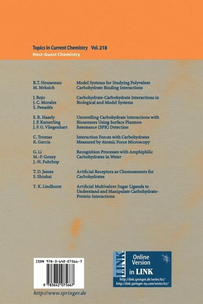 Model Systems for Studying Polyvalent Carbohydrate Binding Interactions.- Carbohydrate-Carbohydrate Interactions in Biological and Model Systems.- Unravelling Carbohydrate Interactions with Biosensors Using Surface Plasmon Resonance (SPR) Detection.- Interaction Forces with Carbohydrates Measured by Atomic Force Microscopy.- Recognition Processes with Amphiphilic Carbohydrates in Water.- Artificial Receptors as Chemosensors for Carbohydrates.- Artificial Multivalent Sugar Ligands to Understand and Manipulate Carbohydrate-Protein Interactions.