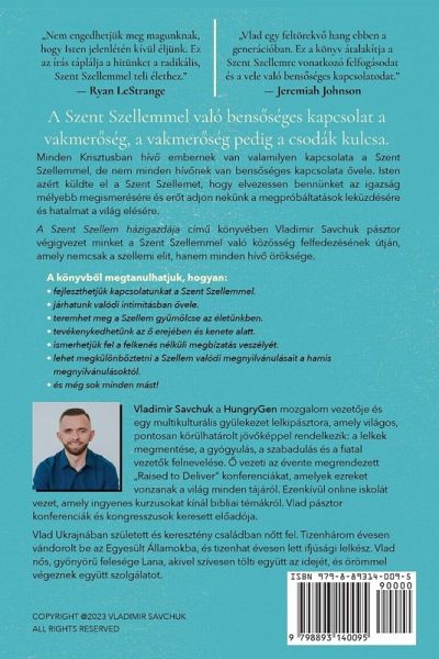 A Szent Szellemmel való bens¿séges kapcsolat a vakmer¿ség, a vakmer¿ség pedig a csodák kulcsa. Minden Krisztusban hív¿ embernek van valamilyen kapcsolata a Szent Szellemmel, de nem minden hív¿nek van bens¿séges kapcsolata ¿vele. Isten azért küldte el a Szent Szellemet, hogy elvezessen bennünket az igazság mélyebb megismerésére és er¿t adjon nekünk a megpróbáltatások leküzdésére és hatalmat a világ elésére.A Szent Szellem házigazdája cím¿ könyvében Vladimir Savchuk pásztor végigvezet minket a Szent Szellemmel való közösség felfedezésének útján, amely nemcsak a szellemi elit, hanem minden hív¿ öröksége. A könyvb¿l megtanulhatjuk, hogyan:- fejleszthetjük kapcsolatunkat a Szent Szellemmel.- járhatunk valódi intimitásban ¿vele.- teremhet meg a Szellem gyümölcse az életünkben.- tevékenykedhetünk az ¿ erejében és kenete alatt.- ismerhetjük fel a felkenés nélküli megbízatás veszélyét.- lehet megkülönböztetni a Szellem valódi megnyilvánulásait a hamis megnyilvánulásoktól.- és még sok minden mást! Vladimir Savchuk a HungryGen mozgalom vezet¿je és egy multikulturális gyülekezet lelkipásztora, amely világos, pontosan körülhatárolt jöv¿képpel rendelkezik: a lelkek megmentése, a gyógyulás, a szabadulás és a fiatal vezet¿k felnevelése. ¿ vezeti az évente megrendezett ¿Raised to Deliver" konferenciákat, amelyek ezreket vonzanak a világ minden tájáról. Ezenkívül online iskolát vezet, amely ingyenes kurzusokat kínál bibliai témákról. Vlad pásztor konferenciák és kongresszusok keresett el¿adója. Vlad Ukrajnában született és keresztény családban n¿tt fel. Tizenhárom évesen vándorolt be az Egyesült Államokba, és tizenhat évesen lett ifjúsági lelkész. Vlad n¿s, gyönyör¿ felesége Lana, akivel szívesen tölti együtt az idejét, és örömmel végeznek együtt szolgálatot.
