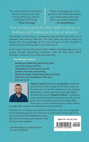 Your intimacy with the Holy Spirit is the key to boldness and boldness is the key to miracles. All believers in Christ have a relationship with the Holy Spirit, but not all believers have intimacy with Him. Holy Spirit was sent to lead you deeper in the knowledge of truth and give you the strength to overcome trials and the power to reach this world. In this book, Pastor Vladimir Savchuk takes you on a journey through discovering the communion with the Holy Spirit which belongs to everyone, not just the spiritually elite. You will learn how to:develop your relationship with the Holy Spirit walk in true intimacy with Him cultivate the fruit of the Spirit in your life operate in His power and anointing identify the danger of appointing without anointing discern the true manifestations of the Spirit and much more! Host the Holy Ghost is a gem-filled work. Pastors and leaders, allow me to humbly suggest this as a small group or leadership curriculum.I encourage you to read this and often revisit the truths upon which it expounds. - David Diga Hernandez Evangelist, Healing Minister, TV host I highly recommend this revelatory book to Christians everywhere. Host the Holy Ghost will transform your understanding about the Holy Spirit and intimacy with Him. - Jeremiah Johnson Apostolic Leader of the Ark Fellowship This book brilliantly describes the desperate need we have as Christians to fellowship with the Holy Spirit! We cannot afford to live beyond or outside of God's presence. This writing will fuel your faith for radical Spirit-filled living. - Ryan LeStrange Founder and Apostolic Leader of TRIBE International Network of Ministries To know the Holy Spirit as your friend is life's greatest treasure, and this book will inspire you to seek His friendship above all others. - Andres Bisonni International Evangelist