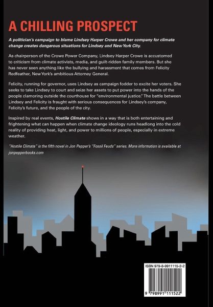 A CHILLING PROSPECT A politician's campaign to blame Lindsey Harper Crowe and her company for climate change creates dangerous situations for Lindsey and New York City. As chairperson of the Crowe Power Company, Lindsey Harper Crowe is accustomed to criticism from climate activists, media, and guilt-ridden family members. But she has never seen anything like the bullying and harassment that comes from Felicity Redfeather, New York's ambitious Attorney General. Felicity, running for governor, uses Lindsey as campaign fodder to excite her voters. She seeks to take Lindsey to court and seize her assets to put power into the hands of the people clamoring outside the courthouse for "environmental justice." The battle between Lindsey and Felicity is fraught with serious consequences for Lindsey's company, Felicity's future, and the people of the city. Inspired by real events, "Hostile Climate" shows in a way that is both entertaining and frightening what can happen when climate change ideology runs headlong into the cold reality of providing heat, light, and power to millions of people, especially in extreme weather. "Hostile Climate" is the fifth novel in Jon Pepper's "Fossil Feuds" series. More information is available at jonpepperbooks.com