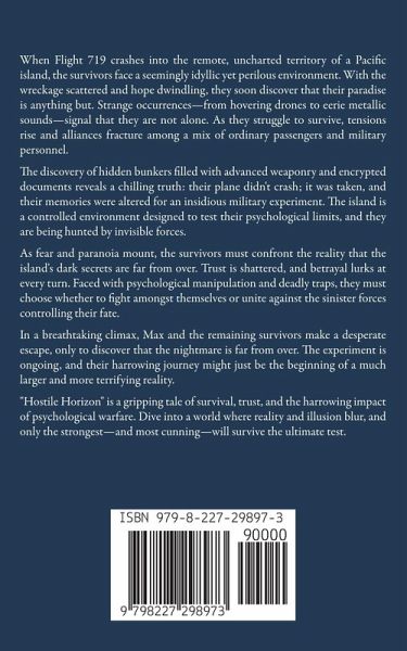 When Flight 719 crashes into the remote, uncharted territory of a Pacific island, the survivors face a seemingly idyllic yet perilous environment. With the wreckage scattered and hope dwindling, they soon discover that their paradise is anything but. Strange occurrences-from hovering drones to eerie metallic sounds-signal that they are not alone. As they struggle to survive, tensions rise and alliances fracture among a mix of ordinary passengers and military personnel. The discovery of hidden bunkers filled with advanced weaponry and encrypted documents reveals a chilling truth: their plane didn't crash; it was taken, and their memories were altered for an insidious military experiment. The island is a controlled environment designed to test their psychological limits, and they are being hunted by invisible forces. As fear and paranoia mount, the survivors must confront the reality that the island's dark secrets are far from over. Trust is shattered, and betrayal lurks at every turn. Faced with psychological manipulation and deadly traps, they must choose whether to fight amongst themselves or unite against the sinister forces controlling their fate. In a breathtaking climax, Max and the remaining survivors make a desperate escape, only to discover that the nightmare is far from over. The experiment is ongoing, and their harrowing journey might just be the beginning of a much larger and more terrifying reality. "Hostile Horizon" is a gripping tale of survival, trust, and the harrowing impact of psychological warfare. Dive into a world where reality and illusion blur, and only the strongest-and most cunning-will survive the ultimate test.