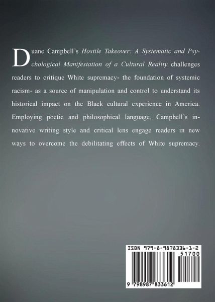 Duane Campbell's Hostile Takeover: A Systematic and Psychological Manifestation of a Cultural Reality challenges readers to critique White supremacy- the foundation of systemic racism- as a source of manipulation and control to understand its historical impact on the Black cultural experience in America. Employing poetic and philosophical language, Campbell's innovative writing style and critical lens engage readers in new ways to overcome the debilitating effects of White supremacy.