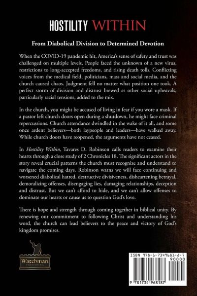 From Diabolical Division to Determined Devotion When the COVID-19 pandemic hit, America's sense of safety and trust was challenged on multiple levels. People faced the unknown of a new virus, restrictions to long-accepted freedoms, and rising death tolls. Conflicting voices from the medical field, politicians, mass and social media, and the church caused chaos. Judgment fell no matter what position one took. A perfect storm of division and distrust brewed as other social upheavals, particularly racial tensions, added to the mix. In the church, you might be accused of living in fear if you wore a mask. If a pastor left church doors open during a shutdown, he might face criminal repercussions. Church attendance dwindled in the wake of it all, and some once ardent believers-both laypeople and leaders-have walked away. While church doors have reopened, the arguments have not ceased. In Hostility Within, Tavares D. Robinson calls readers to examine their hearts through a close study of 2 Chronicles 18. The significant actors in the story reveal crucial patterns the church must recognize and understand to navigate the coming days. Robinson warns we will face continuing and worsened diabolical hatred, destructive divisiveness, disheartening betrayal, demoralizing offenses, disengaging lies, damaging relationships, deception and distrust. But we can't afford to hide, and we can't allow offenses to dominate our hearts or cause us to question God's love. There is hope and strength through coming together in biblical unity. By renewing our commitment to following Christ and understanding his word, the church can lead believers to the peace and victory of God's kingdom promises.