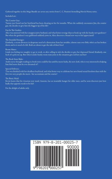 Gathered together in this Mega Bundle are seven sexy stories from C. C. Passion's bestselling Hot & Horny series. Included are: The Courier Guy: Tammy just found out her boyfriend has been cheating on her for months. When she suddenly encounters Jim, the courier guy, she decides to give him the biggest tip of his life! Fun In The Garden: Alice was annoyed with her unappreciative husband, and what better revenge than to hook up with the hunky new gardener? But when the gardener's sexy girlfriend suddenly joins in, Alice discovers a brand new way to feel appreciated! The Stranded Stranger: Kimberly, a recent divorcee in desperate need of a distraction from her troubles, almost runs over Bob, who's car has broken down and in is need of a lift. Both are about to get the ride of their lives! Room Mates: Linda was feeling too naughty to go to work, so after calling in sick she decides to give her depressed friend, Kimberly, one heck of a pick me up. But when Linda's hunky room mate joins in the situation gets red hot real fast! The Book Store Babe: Andre never thought reading at a book store could be fun until he meets Sasha, the new clerk, who is very interested in helping him find more than he ever dreamed of! Special Delivery: Tina was finished with her deadbeat boyfriend, and what better way to celebrate her new found sexual freedom than with the first two sexy people she meets - her accountant and the courier! The Busty Maid: Kevin learns that his vivacious new maid, Annette, has an insatiable hunger for older men, and he soon discovers just how badly that appetite needs to be fed! For the delight of adults only.