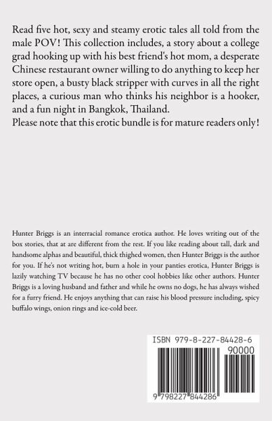 Read five hot, sexy and steamy erotic tales all told from the male POV! This collection includes, a story about a college grad hooking up with his best friend's hot mom, a desperate Chinese restaurant owner willing to do anything to keep her store open, a busty black stripper with curves in all the right places, a curious man who thinks his neighbor is a hooker, and a fun night in Bangkok, Thailand. Please note that this erotic bundle is for mature readers only!