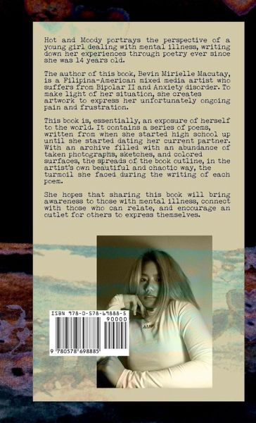 Hot and Moody portrays the perspective of a young girl dealing with mental illness, writing down her experiences through poetry ever since she was 14 years old. The author of this book, Bevin Mirielle Macutay, is a Filipina-American mixed media artist who suffers from Bipolar II and Anxiety disorder. To make light of her situation, she creates artwork to express her unfortunately ongoing pain and frustration. This book is, essentially, an exposure of herself to the world. It contains a series of poems, written from when she started high school up until she started dating her current partner. With an archive filled with an abundance of taken photographs, sketches, and colored surfaces, the spreads of the book outline, in the artist's own beautiful and chaotic way, the turmoil she faced during the writing of each poem. She hopes that sharing this book will bring awareness to those with mental illness, connect with those who can relate, and encourage an outlet for others to express themselves.