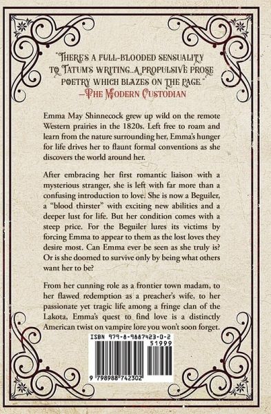 Emma May Shinnecock grew up wild on the remote Western prairies in the 1820s. Left free to roam and learn from the nature surrounding her, Emma's hunger for life drives her to flaunt formal conventions as she discovers the world around her. After embracing her first romantic liaison with a mysterious stranger, she is left with far more than a confusing introduction to love. She is now a Beguiler, a "blood thirster" with exciting new abilities and a deeper lust for life. But her condition comes with a steep price. For the Beguiler lures its victims by forcing Emma to appear to them as the lost loves they desire most. Can Emma ever be seen as she truly is? Or is she doomed to survive only by being what others want her to be? From her cunning role as a frontier town madam, to her flawed redemption as a preacher's wife, to her passionate yet tragic life among a fringe clan of the Lakota, Emma's quest to find love is a distinctly American twist on vampire lore you won't soon forget.