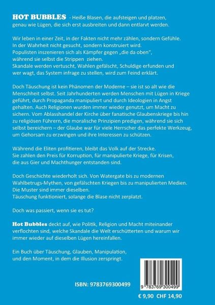 Hot Bubbles Macht, Manipulation und die Kunst des Lügens Willkommen in der Realität Dies ist kein Buch für Zartbesaitete. Hot Bubbles ist kein höfliches Nicken zu den Absurditäten unserer Zeit. Es ist ein Schlag in die Magengrube der Realität, eine brennend heiße Dusche aus Wahrheit, Zynismus und der Frage, die sich jeder stellen sollte: Wer zieht hier eigentlich die Fäden? Wir leben in einer Welt, in der Konzerne mächtiger sind als Staaten, Milliardäre sich benehmen wie Könige und die Politik oft nur noch als Schauspielbühne dient. Korruption ist keine Ausnahme, sondern System. Steuerskandale, Wirtschaftsbetrug, politische Intrigen, alles läuft nach den gleichen alten Regeln, nur mit neuen Namen und teureren Anzügen. Und während oben gelogen, betrogen und manipuliert wird, bekommen wir unten ein paar nette Ablenkungen serviert: Social Media, Reality-TV, Rabattcodes und den neuesten Trend auf TikTok. Brot und Spiele für das digitale Zeitalter, nur dass wir uns dieses Mal selbst bespaßen und auch noch begeistert applaudieren. Dieses Buch kratzt an der Fassade. Es stellt unbequeme Fragen, bohrt nach, zeigt auf, lacht über das Offensichtliche und hält den Finger genau dahin, wo es wehtut. Weil es weh tun muss. Denn wer die Welt verstehen will, muss bereit sein, hinter die Kulissen zu blicken, auch wenn ihm nicht gefällt, was er dort sieht. Also, tauch ein in die Hot Bubbles, aber verbrenn dich nicht.