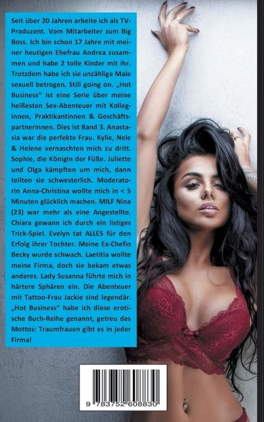Seit über 20 Jahren arbeite ich als TV-Produzent. Vom Mitarbeiter zum Big Boss. Ich bin schon 17 Jahre lang mit meiner heutigen Ehefrau Andrea zusammen und habe zwei tolle Kinder mit ihr. Trotzdem habe ich sie unzählige Male sexuell betrogen. Still going on. "Hot Business" ist eine Serie über meine heißesten Sex-Abenteuer mit Kolleginnen, Praktikantinnen und Geschäftspartnerinnen. Dies ist Band 3. Anastasia war die perfekte Frau. Kylie, Nele und Helene vernaschten mich zu dritt. Sophie, die Königin der Füße. Juliette und Olga kämpften um mich, dann teilten sie schwesterlich. Moderatorin Anna-Christina wollte mich in unter fünf Minuten glücklich machen. MILF Nina (23) war mehr als nur eine Angestellte. Chiara gewann ich durch ein listiges Trickspiel. Evelyn tat alles für den Erfolg ihrer Tochter. Meine Ex-Chefin Becky wurde schwach. Laetitia wollte meine Firma, tja, sie bekam etwas anderes. Lady Susanna führte mich in härtere Sphären ein. Meine Abenteuer mit Tattoo-Frau Jackie (34) sind legendär.