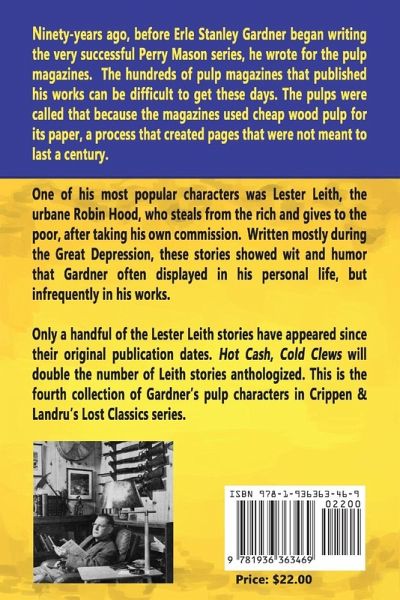 Ninety-years ago, before Erle Stanley Gardner began writing the very successful Perry Mason series, he wrote for the pulp magazines. The hundreds of pulp magazines that published his works can be difficult to get these days. The pulps were called that because the magazines used cheap wood pulp for its paper, a process that created pages that were not meant to last a century. One of his most popular characters was Lester Leith, the urbane Robin Hood, who steals from the rich and gives to the poor, after taking his own commission. Written mostly during the Great Depression, these stories showed wit and humor that Gardner often displayed in his personal life, but infrequently in his works. Only a handful of the Lester Leith stories have appeared since their original publication dates. Hold Cash, Cold Clews will double the number of Leith stories anthologized. This is the fourth collection of Gardner s pulp characters in Crippen & Landru s Lost Classics series