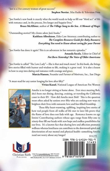 Amelia is no longer sitting at home alone. Ever since meeting Bob, she’s been out dining, dancing, cruising, or traveling the California coast in their RV. How did Amelia meet Bob? This is the question most often asked by seniors over fifty who are seeking new ways to brighten their lives with romantic love and fun-filled friendship. These fifty heart-warming, uplifting, inspiring love stories of how real people from all walks of life met in later life prove that the flame of love does not fade with age. Romance knows no age limits! Contributing authors whose ages range from fifty-one to ninety-four fill our heads with new hope and endless possibilities for our lives. It’s a known fact that sharing love and affection promotes wellness whereas loneliness can contribute to the downward spiral and deterioration of our mental and physical health--something Amelia need not worry about any longer!