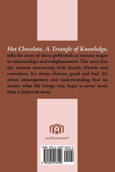Hot Chocolate, A Triangle of Knowledge, tells the story of three girlfriends at various stages in relationships and enlightenment. The story has the women interacting with family, friends and coworkers. It's about choices, good and bad. It's about consequences and understanding that no matter what life brings you, hope is never more than a daybreak away.