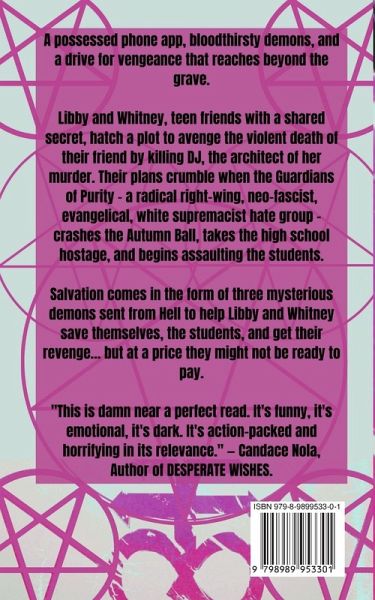 A possessed phone app, bloodthirsty demons, and a drive for vengeance that reaches beyond the grave. Libby and Whitney, teen friends with a shared secret, hatch a plot to avenge the violent death of their friend by killing DJ, the architect of her murder. Their plans crumble when the Guardians of Purity - a radical right-wing, neo-fascist, evangelical, white supremacist hate group - crashes the Autumn Ball, takes the high school hostage, and begins assaulting the students. Salvation comes in the form of three mysterious demons sent from Hell to help Libby and Whitney save themselves, the students, and get their revenge... but at a price they might not be ready to pay. Content Warnings: Anti-Christianity (Pfft. Like this should be a CW. Get thicker skin.) Cannibalism Emotional Abuse and Manipulation Extreme Violence Foul Language Gore Gun Violence Homophobia Misogyny Murder (so much murder) Physical Dismemberment Racism Rape/Sexual Assault (and it's not off-screen) School Shootings Sexism Sexual Situations with Those Under 18 Suicidal Ideation Torture Transphobia