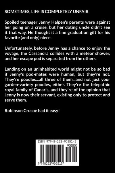 SOMETIMES, LIFE IS COMPLETELY UNFAIR Spoiled teenager Jenny Halpen's parents were against her going on a cruise, but her doting uncle didn't see it that way. He thought it a fine graduation gift for his favorite (and only) niece. Unfortunately, before Jenny has a chance to enjoy the voyage, the Cassandra collides with a meteor shower, and her escape pod is separated from the others. Landing on an uninhabited world might not be so bad if Jenny's pod-mates were human, but they're not. They're poodles...all three of them...and not just your garden-variety poodles, either. They're the telepathic royal family of Canaris, and they're of the opinion that Jenny is now their servant, existing only to protect and serve them. Robinson Crusoe had it easy!