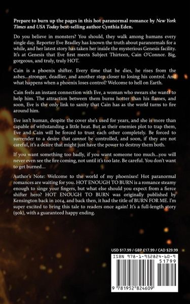 Prepare to burn up the pages in this hot paranormal romance by New York Times and USA Today best-selling author Cynthia Eden. Do you believe in monsters? You should, they walk among humans every single day. Reporter Eve Bradley has known the truth about paranormals for a while, and her latest story has taken her inside the mysterious Genesis facility. It's at Genesis that Eve first meets Subject Thirteen, Cain O'Connor. Big, gorgeous, and truly, truly HOT. Cain is a phoenix shifter. Every time that he dies, he rises from the ashes...stronger, deadlier, and another step closer to losing his control. And what happens when a phoenix loses control? Welcome to hell on Earth. Cain feels an instant connection with Eve, a woman who swears she wants to help him. The attraction between them burns hotter than his flames, and soon, Eve is the only link to sanity that Cain has as the world turns to fire around him. Eve isn't human, despite the cover she's used for years, and she is more than capable of withstanding a little heat. But as their enemies plot to trap them, Eve and Cain will be forced to trust each other completely. Be forced to surrender to a desire that cannot be controlled, and soon, if they are not careful, it's a desire that might just have the power to destroy them both. If you want something too badly, if you want someone too much...you will never even see the fire coming, not until it's too late. Be careful. You don't want to get burned... Author's Note: Welcome to the world of my phoenixes! Hot paranormal romances are waiting for you. HOT ENOUGH TO BURN is a romance steamy enough to singe your fingers, but what else should you expect from a fierce shifter hero? HOT ENOUGH TO BURN was originally published by Kensington back in 2014, and back then, it had the title of BURN FOR ME. I'm super excited to bring this tale to readers once again! It's a full-length story (90k), with a guaranteed happy ending. **HOT ENOUGH TO BURN is a re-release. It was originally published in 2014 as BURN FOR ME.**