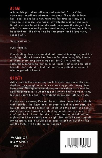 Adam A bonafide pop diva, all sass and scandal, Cristy Valor commands headlines wherever she goes. The tabloids love her-and love to hate her. From the first time her sexy alto voice rolls over me, she has all my attention. When she joins Balefire on our latest tour, she sashays across the stage in her wild-ass costumes and parties hard enough to keep up with my boys and me. She drives me batsh*t-crazy--and I love every second of it. Sex on stilettos. Pure trouble. Our sizzling chemistry could shoot a rocket into space, and it's not long before I crave her. For the first time in my life, I want to share everything with a woman. But Cristy is hiding something, something that holds her back from giving me all of herself. She's about to find out that I'm a patient man-and I always get what I want. Cristy Adam Tron is the poster boy for tall, dark, and sexy. His bass rhythms are enough to make me cream my panties every time I hear them. Flirting with him during our live shows is a rush but nothing compared to what happens when I finally give in to my lust and share his bed. The problem is, sex isn't all he wants. For my entire career, I've set the narrative, teased the tabloids with scandals that kept them too busy to look into my past, too busy to discover the secret that could end the party for good. Adam Tron could wreck me, steal my heart-and my music. I can't let him in. I can't let him discover the secret behind the nightmares I have nearly every night. He thinks he can slay all my monsters, and it would be so easy to let him. But if he finds out the truth, will he still be hot for me?