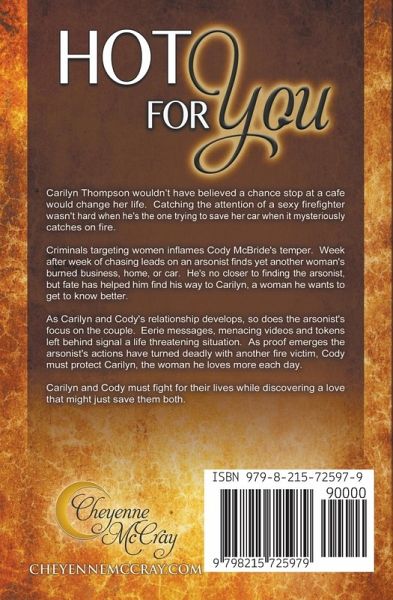 Carilyn Thompson would never have believed a chance stop at a small town cafe would change her life. Catching the attention of the sexiest firefighter she'd ever seen wasn't too difficult when he's the one trying to save everything she owns from going up in flames when her car mysteriously catches fire. Criminals targeting women for any reason inflames Cody McBride's temper, especially when one of the women is as sweet and beautiful as Carilyn Thompson. Week after week of chasing leads on this arsonist finds yet another woman's burned home or business and now Carilyn's car. As Carilyn and Cody's relationship develops, so does the arsonist's focus on the couple, specifically Carilyn. Cody must do whatever he can to protect Carilyn, the woman he is growing to love more each day. Carilyn and Cody must fight for their lives while discovering a love that might just save them both.