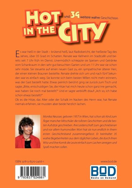 Hot in the City ... ist eine Sammlung von humorvollen Geschichten, die dem Autor von Verwandten, Freunden, Bekannten zugetragen und tatsächlich erlebt wurden. Es sind teils lustige, teils skurrile und filmreife Erlebnisse, die wieder mal deutlich machen, dass das wahre Leben die beste Regie führt und die besten Geschichten liefert.Es war heiß in der Stadt - brütend heiß, laut Radiobericht, der heißeste Tag des Jahres, über 35 Grad im Schatten. Renate war Kellnerin im Stadtcafe und bereits seit 7 Uhr Früh im Dienst. Unermüdlich schleppte sie Speisen und Getränke vom Schankraum in den sehr gut besuchten Garten und um 11 Uhr war sie schon sehr müde. Sie steuerte auf einen neuen Gast zu, ein sympathischer, älterer Herr, der einen kleinen Braunen bestellte. Renate drehte sich um und nach fünf Sekundenwar es einfach weg. Sie konnte sich beim besten Willen nicht mehr erinnern, was der Gast bestellt hatte. Etwas peinlich berührt ging sie zurück zum Tisch und sagte: "Bitte, entschuldigen Sie, die Hitze hat mich heute schon ganz irre gemacht, was noch mal haben Sie bestellt?" Und er sagte verblüfft: "Ach so, ich habe schon etwas bestellt?" Ob es die Hitze, das Alter oder der Schalk im Nacken des Herrn war, hat Renate niemals erfahren, sie mussten aber beide herzlich lachen.