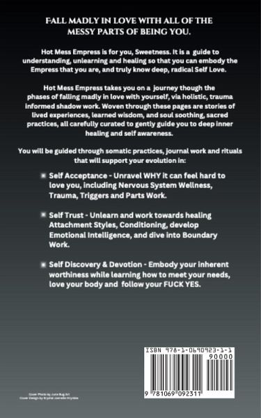 Fall madly in love with all of the messy parts of being you. Hot Mess Empress is for you, Sweetness. It is a guide to understanding, unlearning and healing so that you can embody the Empress that you are, and truly know deep, radical Self Love. Hot Mess Empress takes you on a journey though the phases of falling madly in love with yourself, via holistic, trauma informed shadow work. Woven through these pages are stories of lived experiences, learned wisdom, and soul soothing, sacred practices, all carefully curated to gently guide you to deep inner healing and self awareness. You will be guided through somatic practices, journal work and rituals that will support your evolution in: Self Acceptance - Unravel WHY it can feel hard to love you, including Nervous System Wellness, Trauma, Triggers and Parts Work. Self Trust - Unlearn and work towards healing Attachment Styles, Conditioning, develop Emotional Intelligence, and dive into Boundary Work. Self Discovery & Devotion - Embody your inherent worthiness while learning how to meet your needs, love your body and follow your FUCK YES. Hot Mess Empress is for women and gender diverse people who want to know the bliss that comes with being madly in love with THEMSELVES. A guide for those just beginning their healing, or those who want to deepen their self awareness, Hot Mess Empress combines modern science with magick and spirit, creating a trauma informed guide to Self Love and unapologetic authenticity.