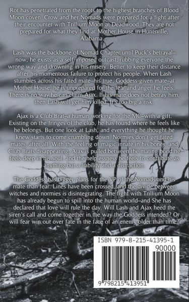 Rot has penetrated from the roots to the highest branches of Blood Moon coven. Crow and her Nomads were prepared for a fight after their encounter with Trillium Moon at Deadwood. They are not prepared for what they find at Mother House in Huntsville, Alabama… Lash was the backbone of Nomad Chapter until Puck's betrayal–now, he exists as a self-imposed outcast, rubbing everyone the wrong way and drowning in his misery. Better to keep their distance after his momentous failure to protect his people. When Lash stumbles across his fated mate–his true, Goddess-given mate–at Mother House, he is unprepared for the fear and anger he feels. There is no way he can claim Ajax. If his mate does not betray him, then Lash will get him killed. It's too big a risk. Ajax is a Club Brat–a human working for the MC–with a gift. Existing on the fringes of the club, he has found where he feels like he belongs. But one look at Lash, and everything he thought he knew starts to come crumbling down. Normies don't get fated mates, after all. With the feeling of magic innate in his bones, and Club Brats disappearing, Ajax is pulled between the mating bond he feels deep in his soul, and the helplessness he feels to contribute as anything but a liability and a distraction. The Goddess has bigger plans for the VP of the Nomads and his mate than fear. Lines have been crossed, and the divide between witches and normies is disintegrating. The fight with Trillium Moon has already begun to spill into the human world–and She has declared that love will rule the day. Will Lash and Ajax heed the siren's call and come together in the way the Goddess intended? Or will fear win out over fate in the face of an enemy older than time?