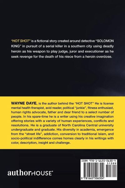 Wayne Daye, is the author behind the "HOT SHOT" He is license mental health therapist, avid reader, pollical 'junkie", fitness enthusiast, human rights advocate, father and dear friend to a select number of people. In his spare-time he is a writer using his creative imagination offering stories with a variety of human experiences, conflicts and resolutions. He is a graduate of North Carolina Central university undergraduate and graduate. His diversity in academia, emergence from the "street life', addiction, conversion to traditional Islam, and socio-political indifference comes homes clearly in his writings with color, description, insight and challenge.