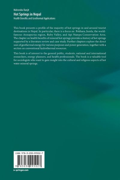 Part I.- Chapter 1. Hot and Mineral Springs in Nepal.- Chapter 2. Introduction to Hot and Mineral Springs.- Chapter 3. Profile of Hot and Healing Springs in Nepal.- Part II.- Chapter 4. Applications of Geothermal Energy.- Chapter 5. Hot and Mineral Spring Waters for Health Benefits.- Chapter 6. Cultural Aspects of Hot Spring.- Chapter 7. Hot Springs and Tourism Development.- Chapter 8. Public Sector's Involvement and Prospects of Geothermal Development in Nepal.