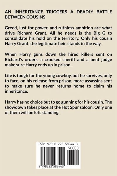 AN INHERITANCE TRIGGERS A DEADLY BATTLE BETWEEN COUSINS Greed, lust for power, and ruthless ambition are what drive Richard Grant. All he needs is the Big G to consolidate his hold on the territory. Only his cousin Harry Grant, the legitimate heir, stands in the way. When Harry guns down the hired killers sent on Richard's orders, a crooked sheriff and a bent judge make sure Harry ends up in prison. Life is tough for the young cowboy, but he survives, only to face, on his release from prison, more assassins sent to make sure he never returns home to claim his inheritance. Harry has no choice but to go gunning for his cousin. The showdown takes place at the Hot Spur saloon. Only one of them will be left standing.