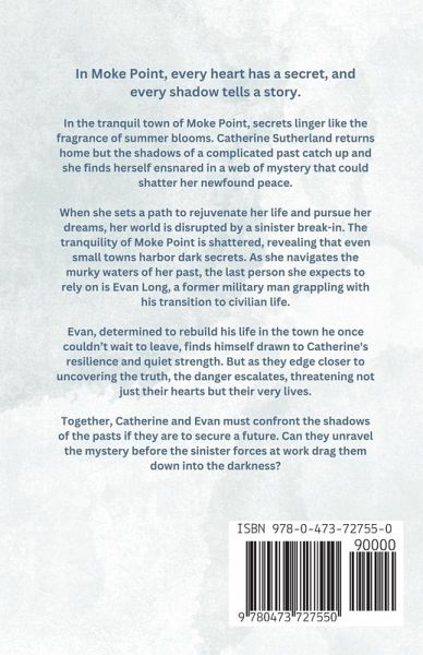 In Moke Point, every heart has a secret, and every shadow tells a story. In the tranquil town of Moke Point, secrets linger like the fragrance of summer blooms. Catherine Sutherland returns home but the shadows of a complicated past catch up and she finds herself ensnared in a web of mystery that could shatter her newfound peace. When she sets a path to rejuvenate her life and pursue her dreams, her world is disrupted by a sinister break-in. The tranquility of Moke Point is shattered, revealing that even small towns harbor dark secrets. As she navigates the murky waters of her past, the last person she expects to rely on is Evan Long, a former military man grappling with his transition to civilian life. Evan, determined to rebuild his life in the town he once couldn't wait to leave, finds himself drawn to Catherine's resilience and quiet strength. But as they edge closer to uncovering the truth, the danger escalates, threatening not just their hearts but their very lives. Together, Catherine and Evan must confront the shadows of the pasts if they are to secure a future. Can they unravel the mystery before the sinister forces at work drag them down into the darkness?