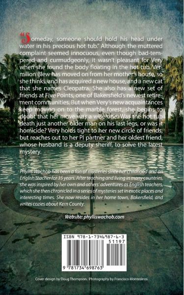 Vermilion Blew, retired librarian and English teacher, has moved on from her mother's house, so she thinks, and has acquired a new home. She also gets a new cat she names Cleopatra. She has a new set of friends at Five Points, one of Bakersfield's newest retirement communities. But when Very's new acquaintances keep moving on to the marble forest, she begins to doubt that her move was a wise one. When she finds a body floating in the hot tub after the annual pool party, she now has concrete reasons to question her precipitous flight from the safety of the old neighborhood. Was the hot tub death just another older man on his last legs, or was it homicide? Very holds tight to her new circle of friends, but reaches out to her PI partner and her oldest friend, whose husband is a deputy sheriff, to solve the latest mystery.
