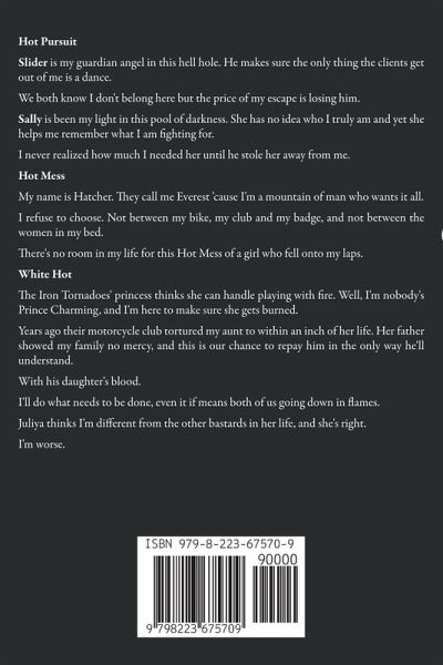 Hot Pursuit Slider is my guardian angel in this hell hole. He makes sure the only thing the clients get out of me is a dance. We both know I don't belong here but the price of my escape is losing him. Sally is been my light in this pool of darkness. She has no idea who I truly am and yet she helps me remember what I am fighting for. I never realized how much I needed her until he stole her away from me. Hot Mess My name is Hatcher. They call me Everest 'cause I'm a mountain of man who wants it all. I refuse to choose. Not between my bike, my club and my badge, and not between the women in my bed. There's no room in my life for this Hot Mess of a girl who fell onto my laps. White Hot The Iron Tornadoes' princess thinks she can handle playing with fire. Well, I'm nobody's Prince Charming, and I'm here to make sure she gets burned. Years ago their motorcycle club tortured my aunt to within an inch of her life. Her father showed my family no mercy, and this is our chance to repay him in the only way he'll understand. With his daughter's blood. I'll do what needs to be done, even it if means both of us going down in flames. Juliya thinks I'm different from the other bastards in her life, and she's right. I'm worse.
