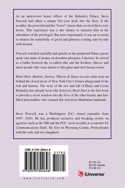 As an undercover house officer of the Helmsley Palace, Steve Peacock had taken a unique five-year peek into the lives of the wealthy, the powerful and the "lower" classes that serviced their every desire. This experience was a rare chance to immerse him in the subculture of the privileged. But more importantly, it was an occasion to witness the underbelly of greed and gluttony existing side-by-side with despair. Peacock watched carefully and quietly as the pampered Palace guests spent vast sums of money on decadent pleasures. Likewise, he served as a buffer between the so-called elite and the hookers, thieves and street people who were drawn to this glass-and-steel luxury tower. Hotel Dick: Harlots, Starlets, Thieves & Sleaze reveals what went on behind the closed doors of New York City's former playground of the rich and famous. The story of the rise and fall of Harry and Leona Helmsley has already been told; however, Hotel Dick is the first book to provide a secret window into the lives of the other bizarre and lust-filled personalities who roamed this notorious Manhattan landmark.