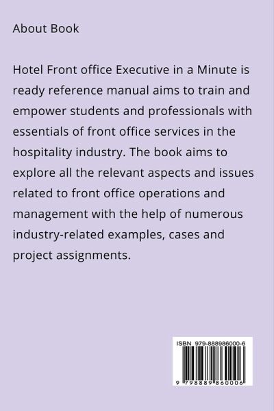 Hotel Front office Executive in a Minute is ready reference manual aims to train and empower students and professionals with essentials of front office services in the hospitality industry. The book aims to explore all the relevant aspects and issues related to front office operations and management with the help of numerous industry-related examples, cases and project assignments.