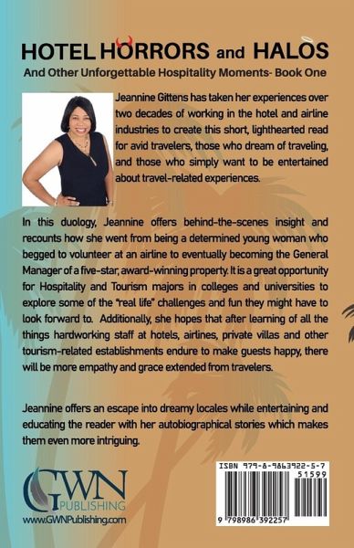 Jeannine Gittens has taken her experiences overm two decades of working in the hotel and airline industries to create this short, lighthearted read for avid travelers, those who dream of traveling, and those who simply want to be entertained about travel-related experiences. In this duology, Jeannine offers behind-the-scenes insight and recounts how a determined young woman went from begging to volunteer at an airline to eventually becoming the General Manager of a 5-star, award-winning property. It is a great opportunity for Hospitality and Tourism majors in colleges and universities to read about some of the "real life" challenges and fun they might have to look forward to. Additionally, Jeannine hopes that after learning of all the things hardworking staff at hotels, airlines, private villas and other tourism-related establishments endure to make guests happy, there will be more empathy and grace extended from travelers. Jeannine offers an escape into dreamy locales while entertaining and educating the reader with her autobiographical stories which makes them even more intriguing.