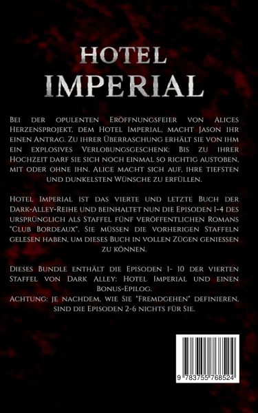 Bei der opulenten Eröffnungsfeier von Alices Herzensprojekt, dem Hotel Imperial, macht Jason ihr einen Antrag. Zu ihrer Überraschung erhält sie von ihm ein explosives Verlobungsgeschenk: Bis zu ihrer Hochzeit darf sie sich noch einmal so richtig austoben, mit oder ohne ihn. Alice macht sich auf, ihre tiefsten und dunkelsten Wünsche zu erfüllen.Hotel Imperial ist das vierte und letzte Buch der Dark-Alley-Reihe und beinhaltet nun die Episoden 1-4 des ursprünglich als Staffel fünf veröffentlichen Romans "Club Bordeaux". Sie müssen die vorherigen Staffeln gelesen haben, um dieses Buch in vollen Zügen genießen zu können.Dieses Bundle enthält die Episoden 1- 10 der vierten Staffel von Dark Alley: Hotel Imperial und einen Bonus-Epilog.Achtung: je nachdem, wie Sie "Fremdgehen" definieren, sind die Episoden 2-6 nichts für Sie.