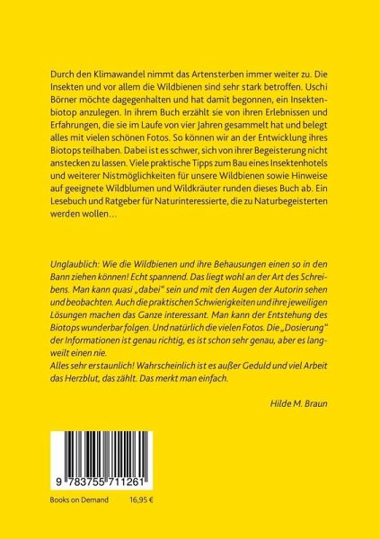 Durch den Klimawandel nimmt das Artensterben immer weiter zu. Die Insekten und vor allem die Wildbienen sind sehr stark betroffen. Uschi Börner möchte dagegenhalten und hat damit begonnen, ein Insektenbiotop anzulegen. In ihrem Buch erzählt sie von ihren Erlebnissen und Erfahrungen, die sie im Laufe von vier Jahren gesammelt hat und belegt alles mit vielen schönen Fotos. So können wir an der Entwicklung ihres Biotops teilhaben. Dabei ist es schwer, sich von ihrer Begeisterung nicht anstecken zu lassen. Viele praktische Tipps zum Bau eines Insektenhotels und weiterer Nistmöglichkeiten für unsere Wildbienen sowie Hinweise auf geeignete Wildblumen und Wildkräuter runden dieses Buch ab. Ein Lesebuch und Ratgeber für Naturinteressierte, die zu Naturbegeisterten werden wollen...