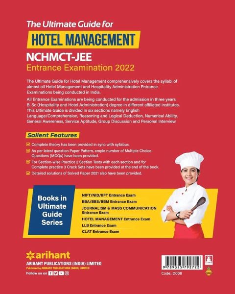 1. The ultimate guide for the preparation of NCHMCT - JEE for B.Sc. Course 2. The book is divided into 5 sections 3. Good number of question have been provided for practice 4. 3 solved Papers, 8 section tests and 3 crack sets are given for thorough practice 5. Answers to section tests and crack sets are given for the complete assistance 6. Group Discussion and personal interview section is mention to make you well prepared Presenting the revised and updated edition of "Ultimate guide for Hotel Management" that is comprehensively covering the complete syllabi of Hotel Management and Hospitality Administration Entrance Examination. In order to build to strong theoretical concepts, it is divided into 5 sections: English Language and Comprehension, Reasoning and Logical Deduction, Numerical Ability, General Awareness, Service Aptitude. Each section ends with 2 section Tests for the quick revision of topics read. Group Discussion & Personal Interviews have been allotted in a different section providing guidance for the final selection of the students. Solved Papers and Crack sets are given for the complete practice also providing the insights of the question and exam pattern. Well detailed and explained answers are given for every Section Tests and Crack Sets for quick revision. TOC Solved Paper (2021-2018), English Language and Comprehension, Reasoning and Logical Deduction, Numerical Ability, General Awareness, Service Aptitude, Group Discussion & Personal Interviews, Crack Sets (1-3), Answers to Section Tests and Crack Sets (1-3).